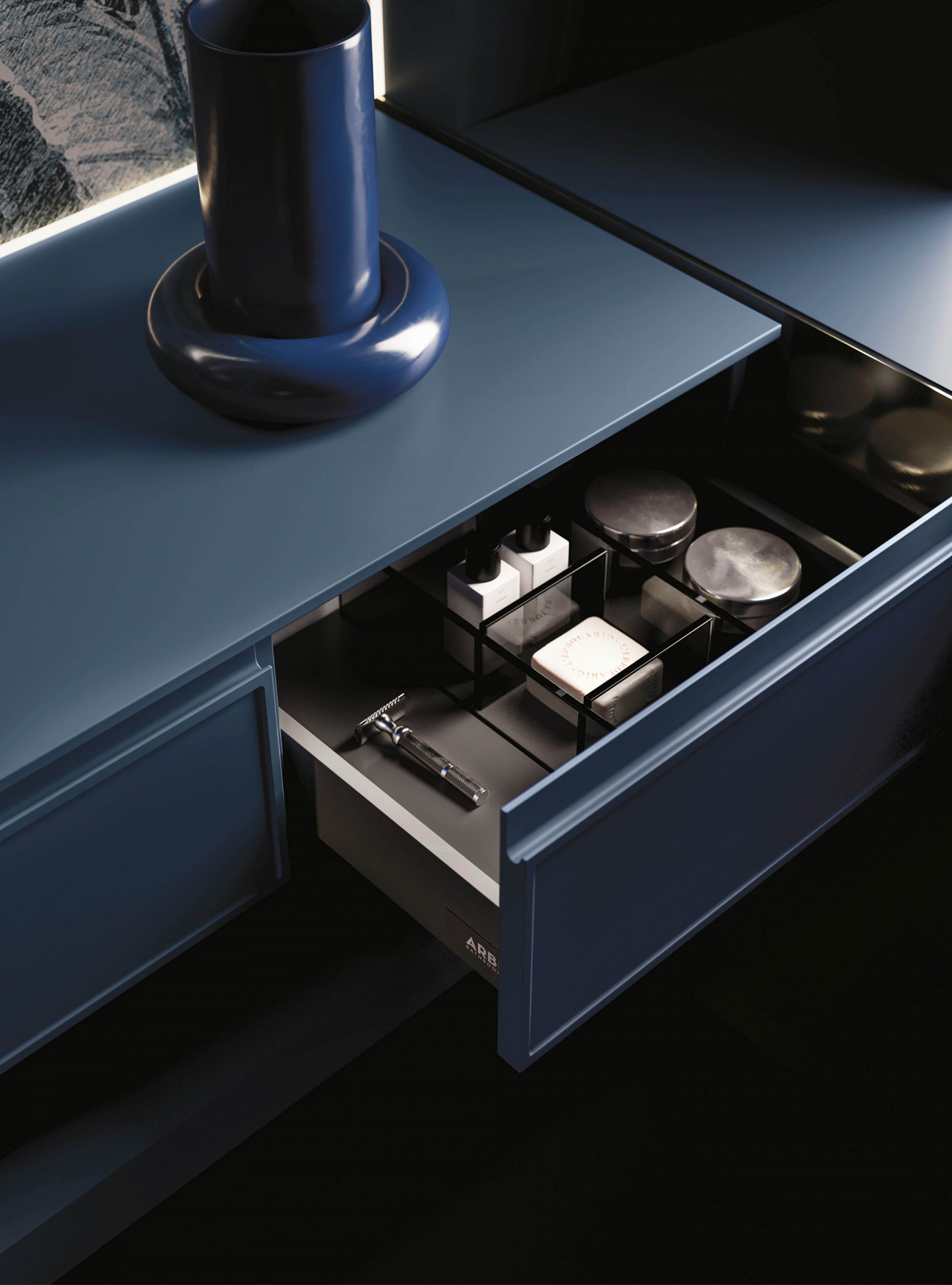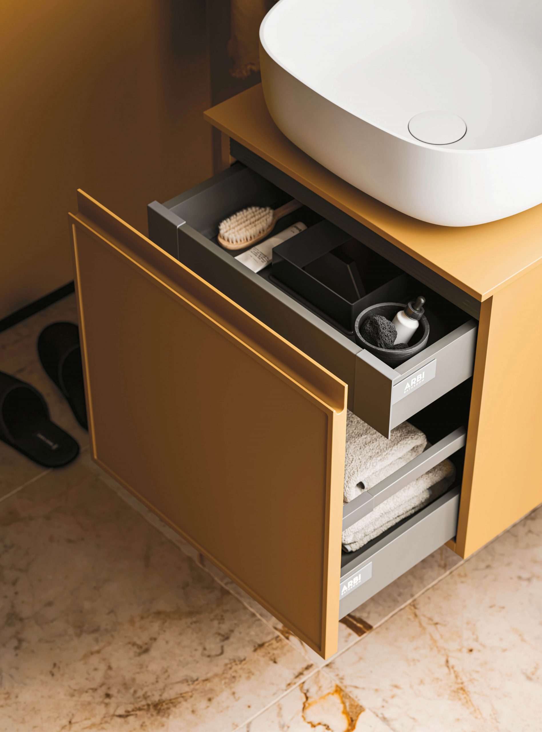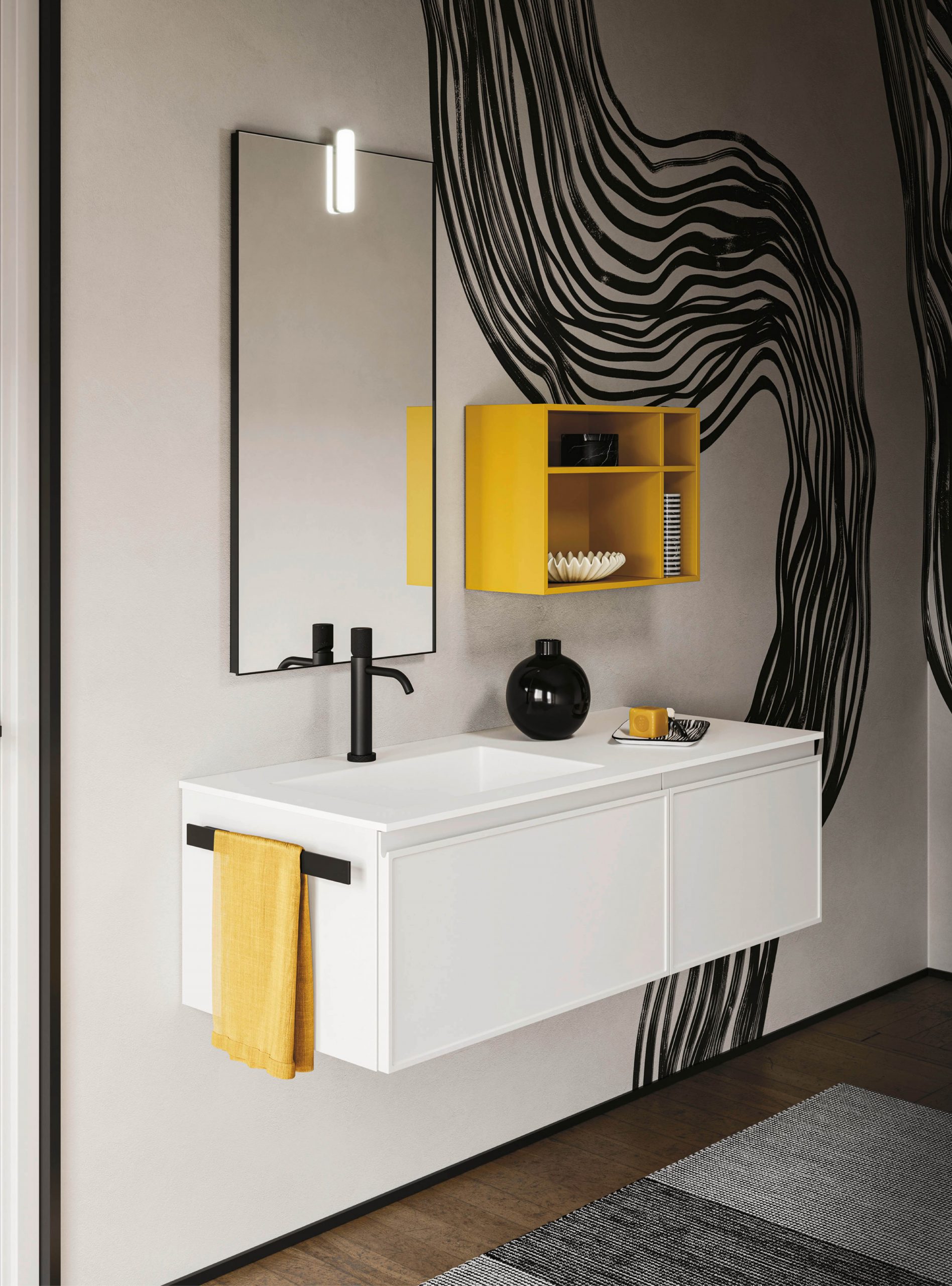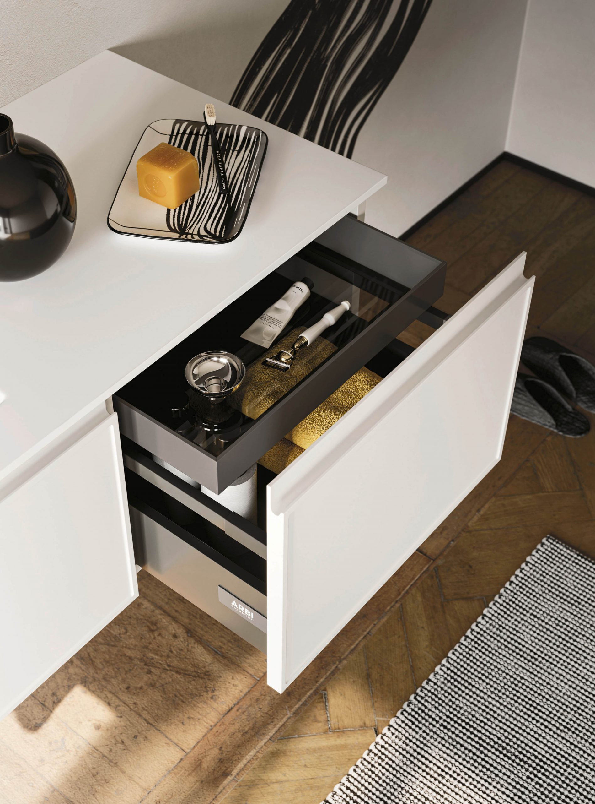 Il modello Decor amplia la nuova collezione di mobili Arbi con anta integrata e si presenta con presa maniglia J. Il particolare decoro sul frontale rende prestigioso l’arredamento infondendo un tocco di originale raffinatezza a tutto l’ambiente bagno.