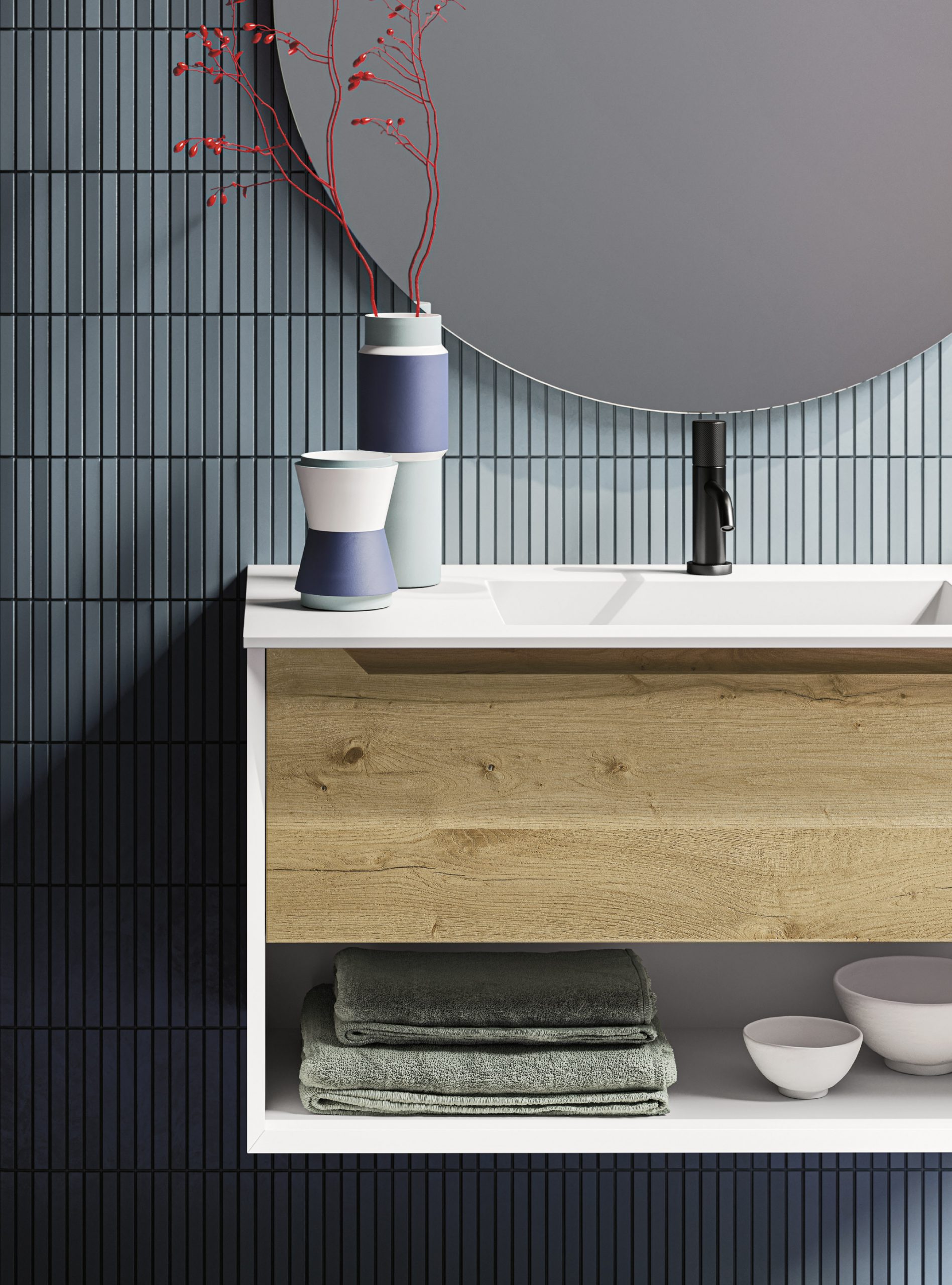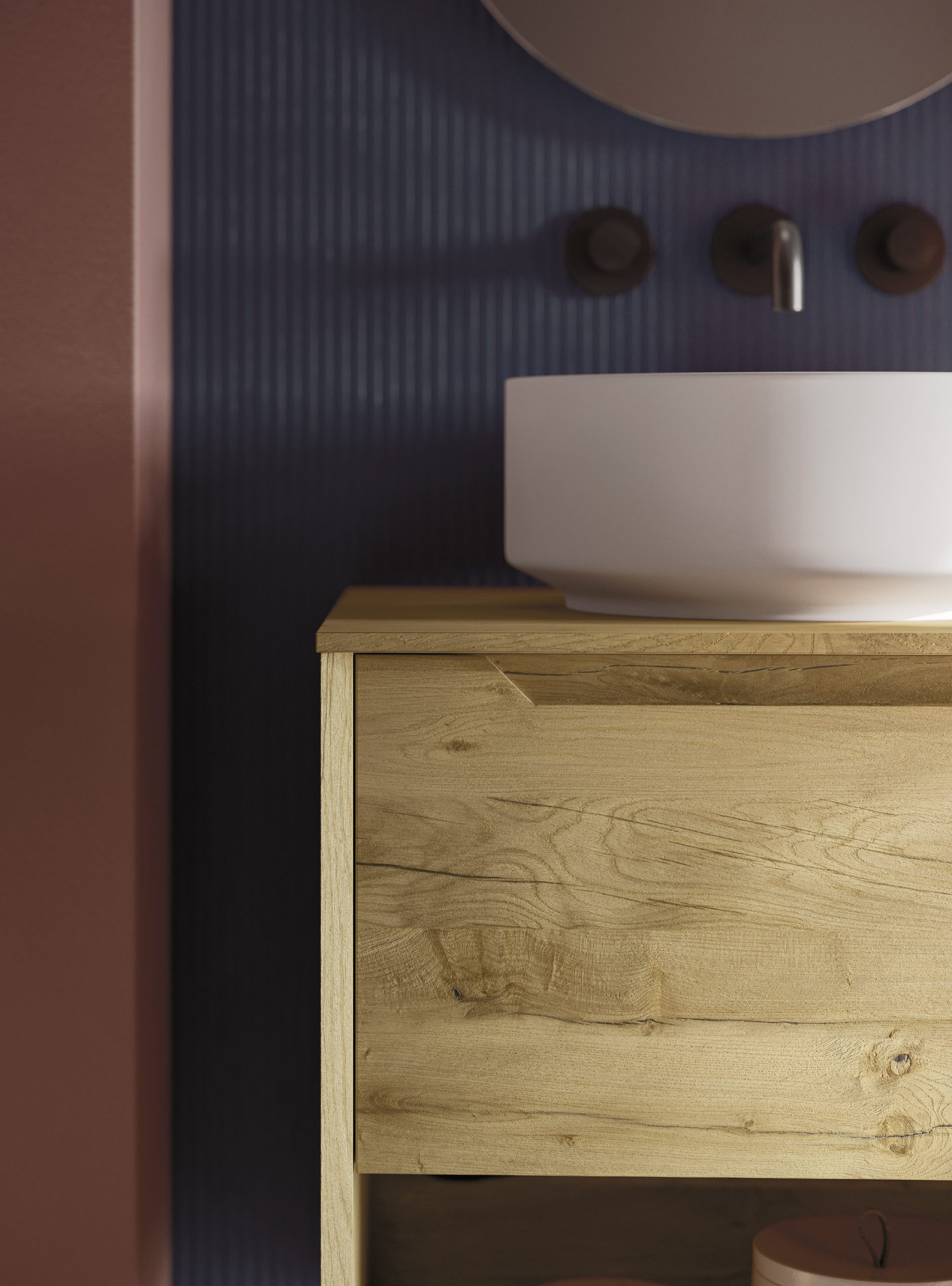 L’ampia palette cromatica e il pregiato legno Rovere rendono la collezione estremamente versatile, adatta a soddisfare ogni gusto e stile di arredamento.