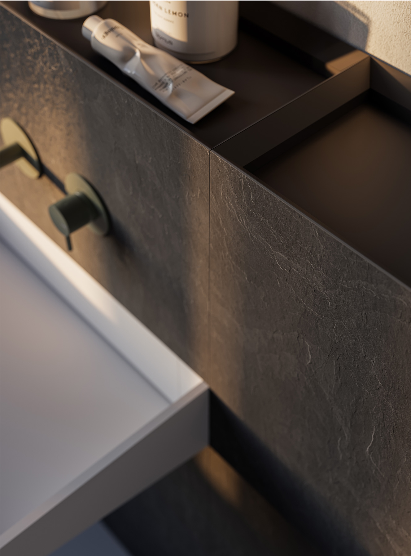 La caratteristica distintiva è l’anta con taglia a 45° che funge da presa maniglia integrata nella parte superiore del frontale.